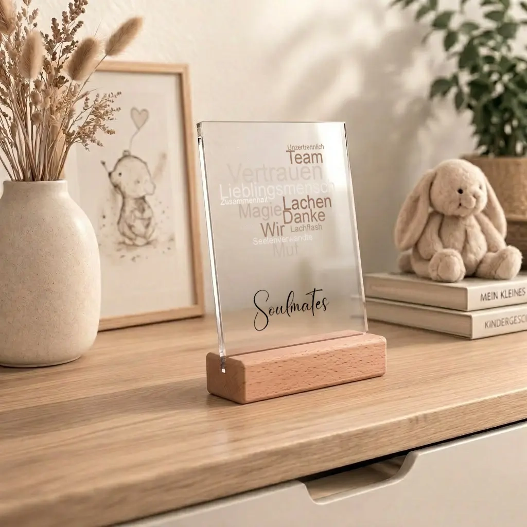 Manchmal sagen wenige Worte mehr als tausend Bilder. Mit unserem personalisierten Acrylbild erschaffst du ein Geschenk, das so individuell ist wie die Verbindung zu deinen Lieblingsmenschen. Ob als Geschenk für die Mama, die beste Freundin oder als romantische Geste für den Partner – dieses Acrylbild fängt eure gemeinsamen Momente in Form einer kunstvollen Wordcloud ein.